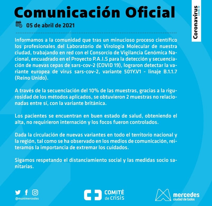 Informamos a la comunidad que tras un minucioso proceso científico los profesionales del Laboratorio de Virología Molecular de Mercedes, trabajando…