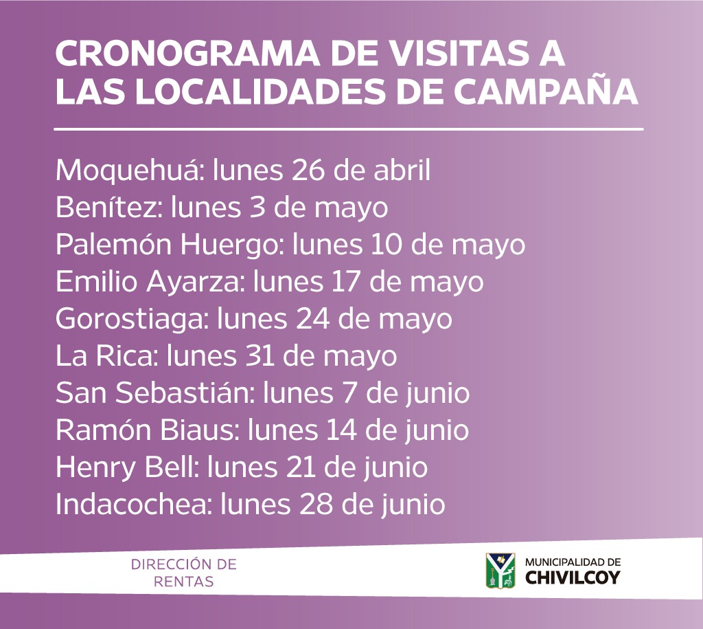 El director de Rentas, Oscar Peracca junto a su personal, estarán presentes en las siguientes localidades de Campaña, para que…