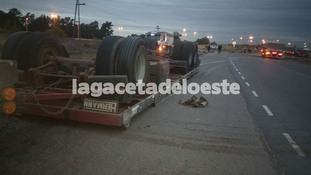 Un camión con acoplado cargado de palos de madera de gran tamaño, sufrió la pinchadura de uno de los neumáticos,…