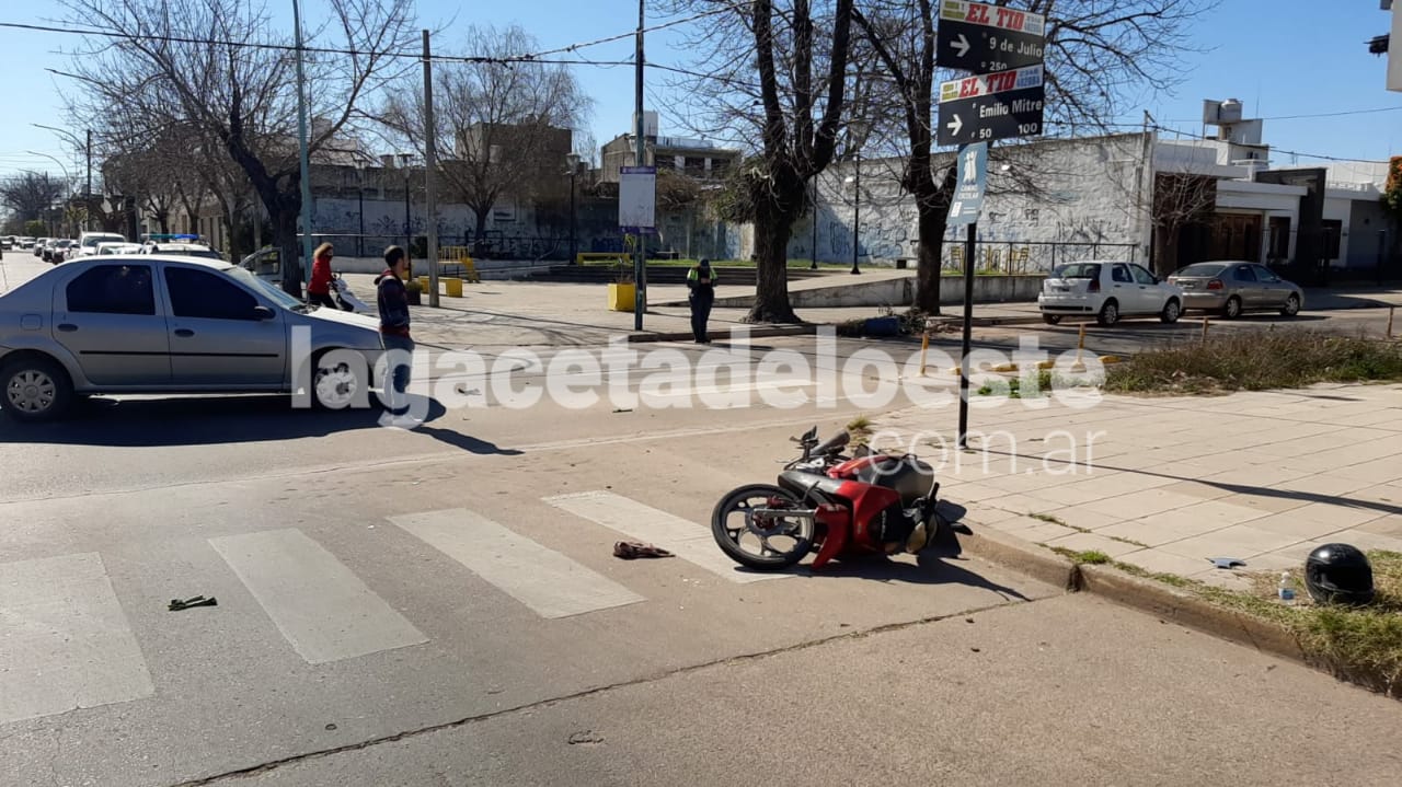 A media mañana, chocaron un auto y una moto en la intersección de las calles Emilio Mitre y 9 de…