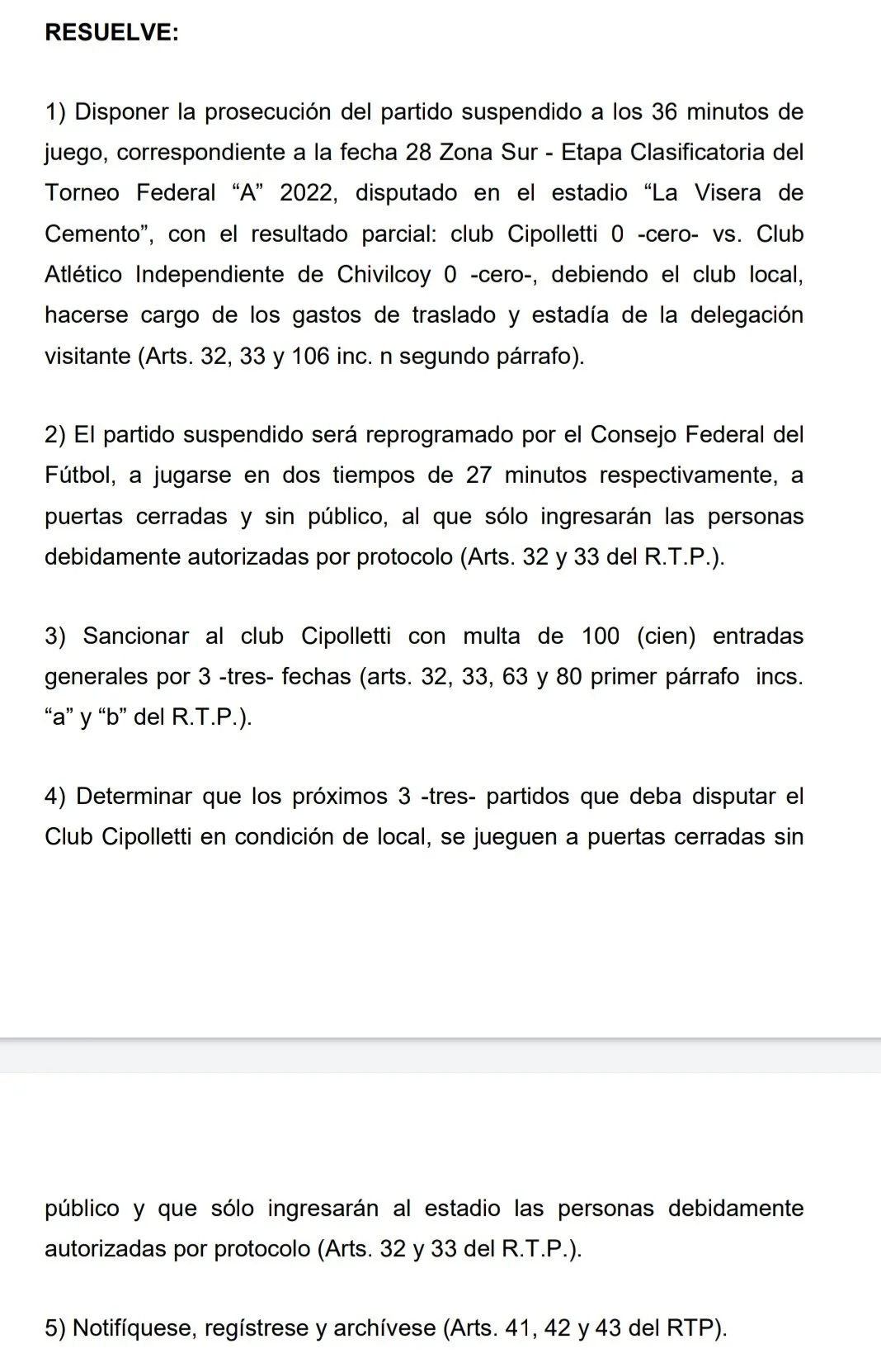 El Tribunal de Disciplina del Consejo Federal hizo oficial la sanción a Cipolletti por los incidentes contra Independiente Chivilcoy durante…