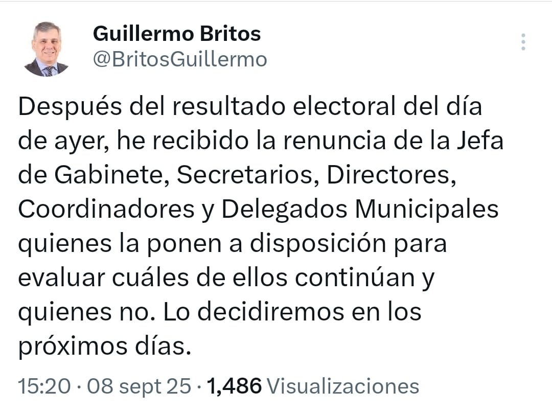 El Intendente Guillermo Britos, luego de la contundente derrota electoral, anunció: «Después del resultado electoral del día de ayer, he recibido la renuncia de la Jefa de Gabinete, Secretarios, Directores, Coordinadores y Delegados Municipales quienes la ponen a disposición para evaluar cuáles de ellos continúan y quienes no. Lo decidiremos en los próximos días». Recordando […]