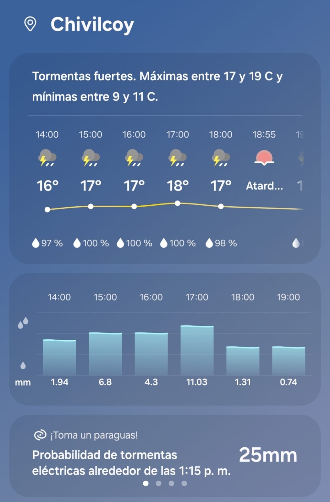 Para esta tarde se esperan tormentas fuertes y lluvias intensas. Las probabilidades de precipitación son altas, acompañadas de temperaturas que no subirán demasiado —rondando los 18-20 °C como máxima, con mínimas frescas. Las tormentas pueden traer momentos de granizo, ráfagas de viento y chaparrones fuertes que disminuirán la visibilidad. Hacia la noche, la intensidad podría […]