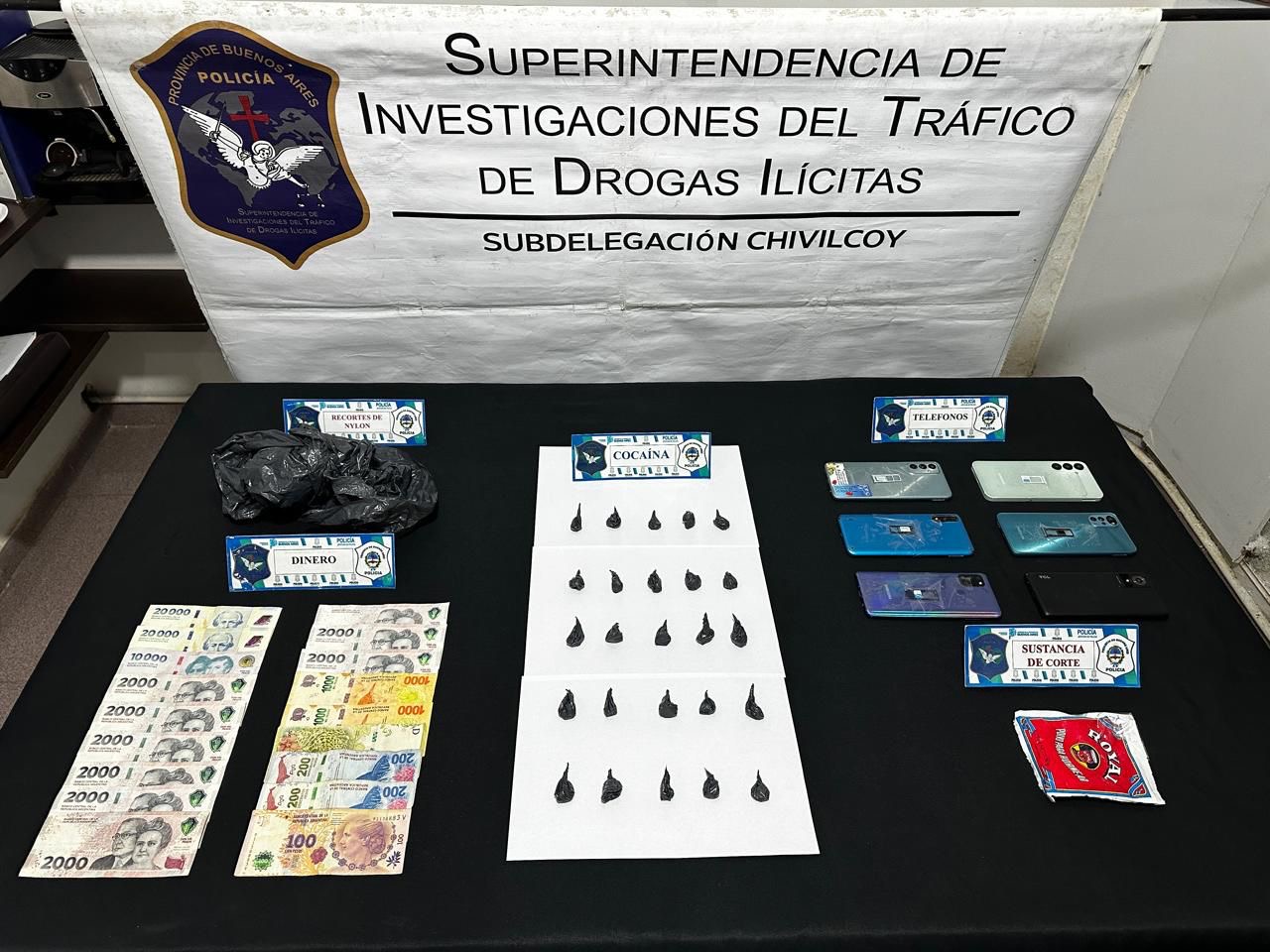 Durante el procedimiento, los efectivos incautaron 26 envoltorios de cocaína listos para su comercialización, seis teléfonos celulares, recortes de nylon y otros elementos de interés para la causa. Tras realizar el test orientativo y el pesaje correspondiente, se determinó un total de 24,2 gramos de sustancia entre contenido y envoltorios.