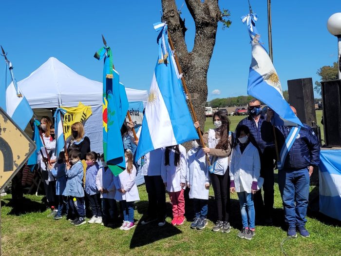También estuvieron presentes el diputado provincial, Fabio Britos; concejales; consejeros escolares; la jefa de Gabinete, Marcela Sabella, junto a funcionarios municipales y abanderados; y escoltas representes de las escuelas del pueblo, fuerzas de seguridad y ex Combatientes de Malvinas.