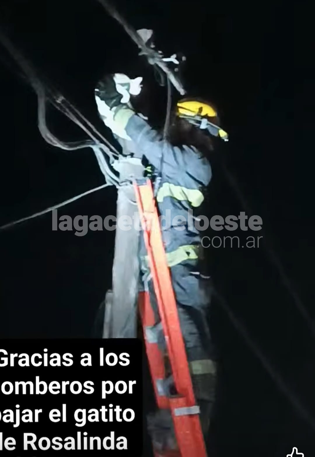 Un emotivo rescate tuvo lugar en la calle 79, numeral 180, en Chivilcoy, cuando un gatito cachorro se trepó a un poste de luz y quedó atrapado entre los cables.