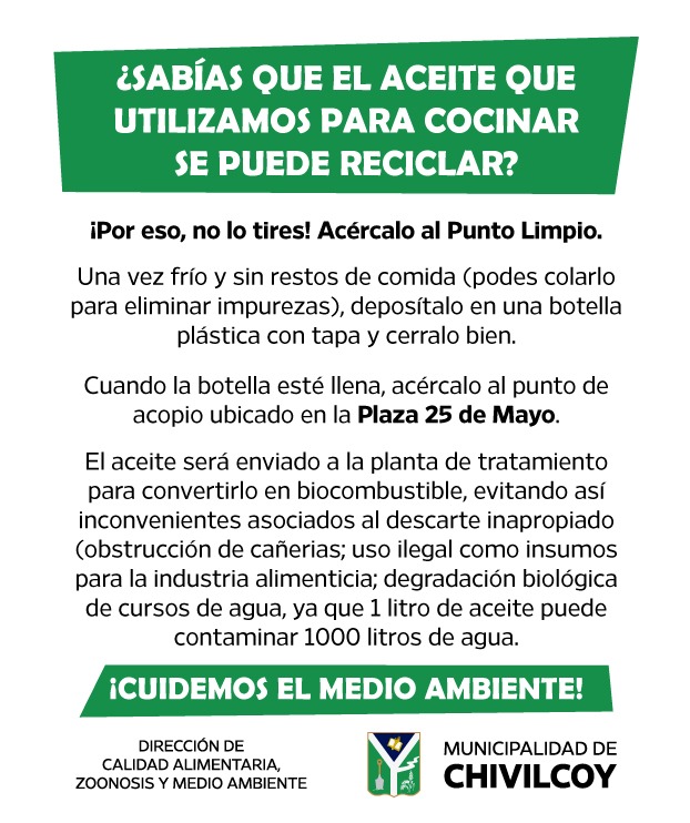 Se invita a la comunidad a sumarse a reciclar el aceite de cocina usado, llevándolo al punto de acopio en…