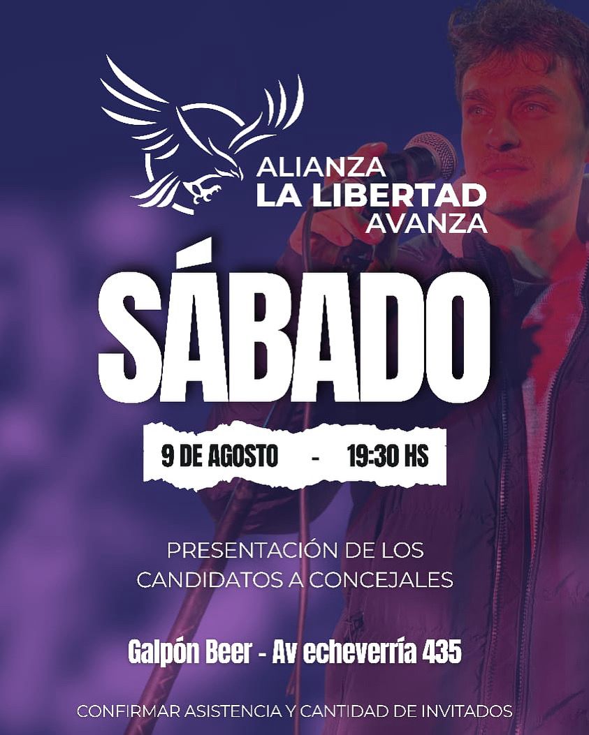 El sábado 9 de agosto desde las 19.30 «Avanza La Libertad Avanza» presenta sus candidatos en Galpón Beer ubicado en Av. Echeverría 435. La invitación es abierta a la comunidad. Los oradores: Gonzalo Cabezas candidato a Senador Provincial por la 4ta Sección electoral, Juan Ignacio Felice quien encabeza la lista local a Concejales y Noelia […]