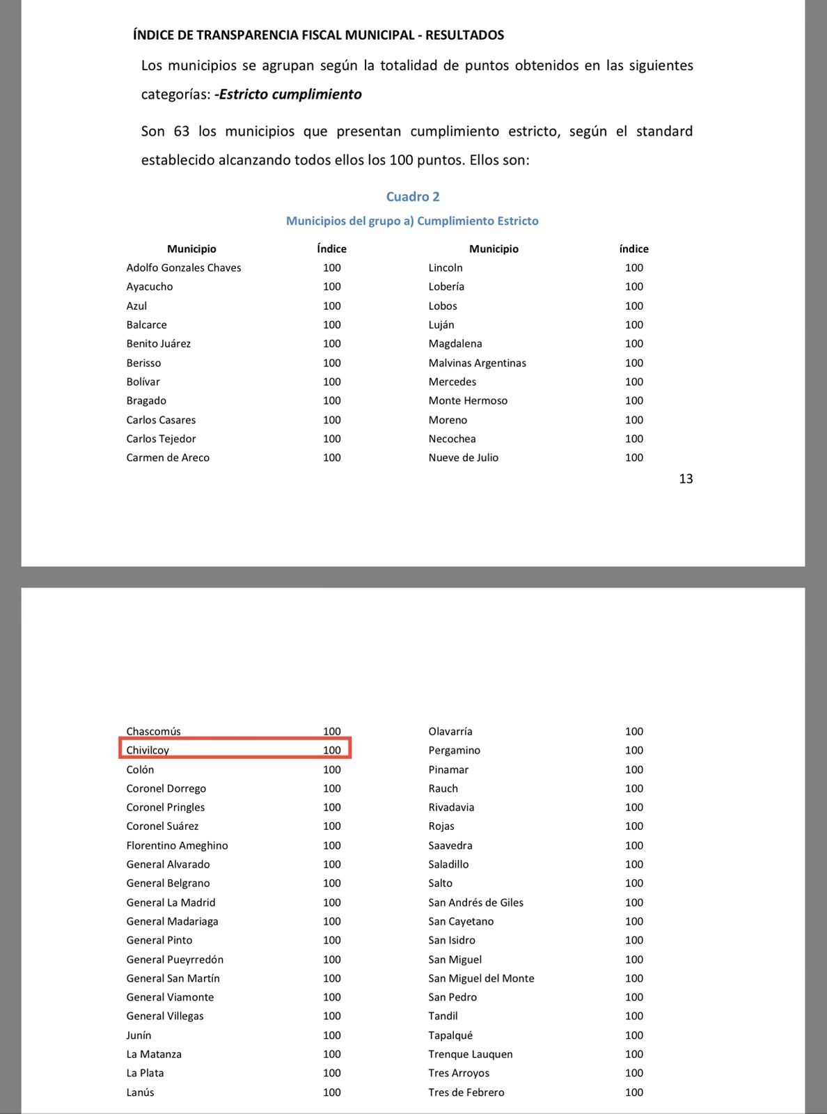 El Municipio de Chivilcoy volvió a ubicarse en el primer puesto en materia de transparencia fiscal, al alcanzar el 100% de cumplimiento en la presentación y difusión de sus cuentas públicas, según el último informe elaborado por la Asociación Argentina de Presupuesto y Administración Pública (ASAP).