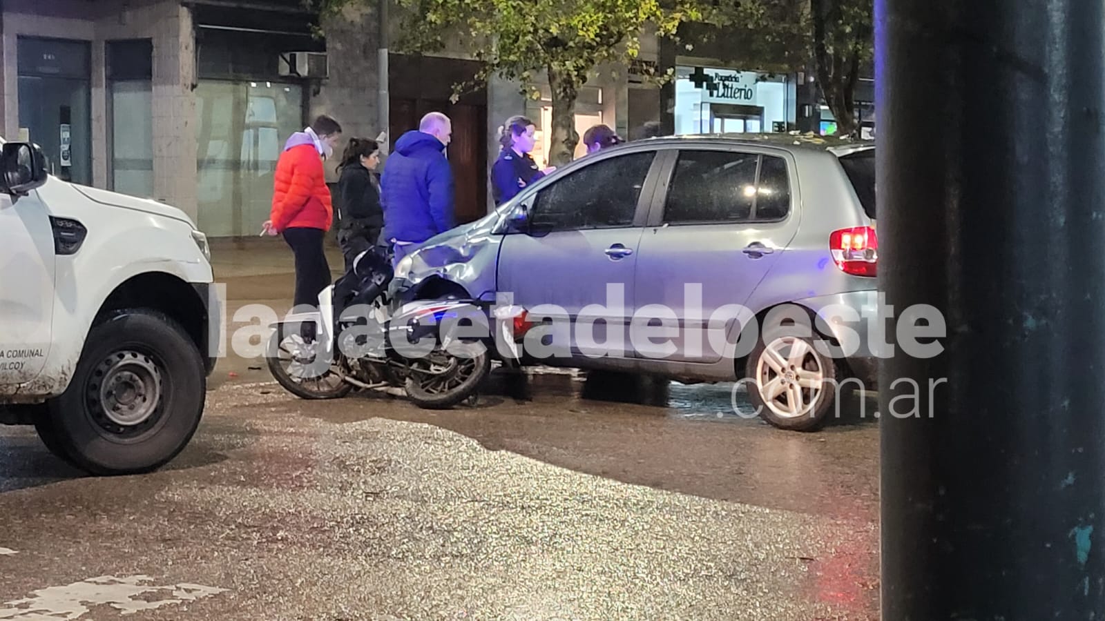 En la intersección de calle Dorrego y Avenida Sarmiento, se produjo una violenta colisión, afortunadamente con heridas leves para el motociclista destacando que llevaba casco colocado.