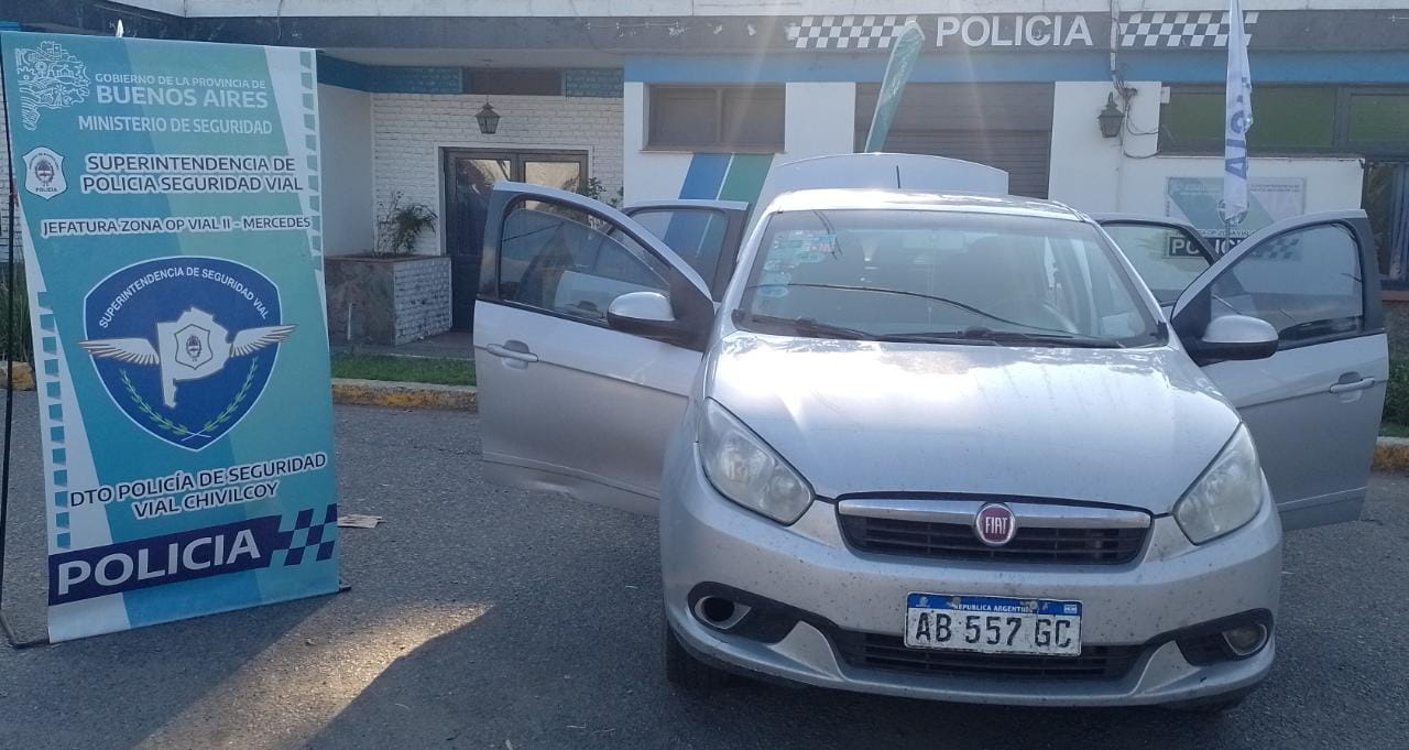 Es un automóvil marca FIAT, modelo SIENA de color GRIS, con dominio colocado AB557GC, conducido por Alejandro Almirón domiciliado en Chivilcoy, quien circulaba en un vehículo con pedido de secuestro activo por robo de automotor con intervención de la U.F.I Nro. 10, a cargo del Dr. Guozden del Departamento Judicial San Martín, habiendo sido sustraído con fecha 05/12/2022.