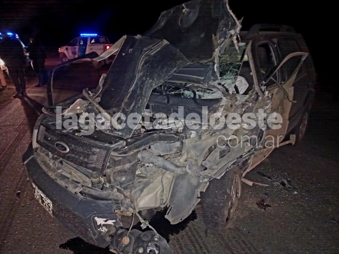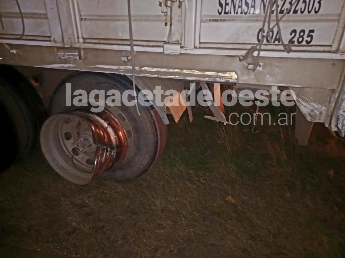 Siendo aproximadamente las 19:10 del lunes, en Ruta Provincial Nro.51 a unos 700metros aproximadamente del cruce con R.N. N°5, por razones que se tratan de establecer, un vehículo marca FORD, modelo ECOSPORT, color negro, dominio JWD-263, conducido por «LANUS BULL, FEDERICO» de 40 años, de Saladillo, quien circulaba sentido Saladillo-Benitez, colisionó con lateral izquierdo de semiremolque marca «HERMANN, dominio, GOA-285, el cual era remolcado por camión marca «SCANIA, mod P94DB, color Blanco, dominio GOR-694, perteneciente empresa «ANDREOLI S.A.» conducido por ZOZARO, BRAIAN MIGUEL de 33 años de Chivilcoy, quien circulaba por carril de R.P. 51 sentido contrario.
