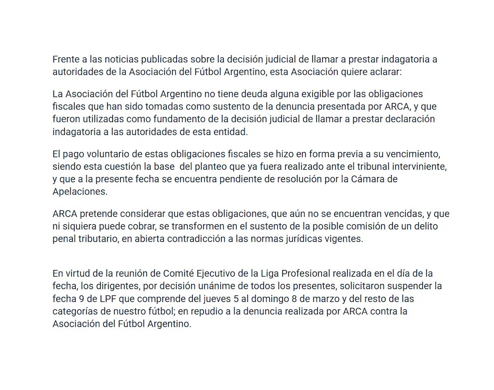 Gustavo Lorenzo, director general de la AFA, presentó una captura de la página oficial de ARCA que, de acuerdo con sus palabras, demuestra que la AFA no registra deudas ni tiene declaraciones juradas pendientes. Con ese documento, los directivos plantearon que la deuda que motivó la causa judicial no existe. La exhibición de ese material resultó determinante para la postura de los clubes: la dirigencia de Primera resolvió impulsar el paro como señal de respaldo institucional.