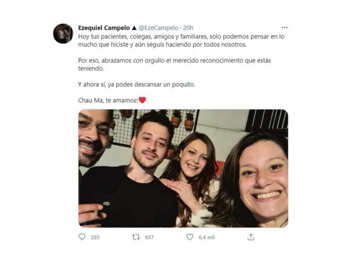 “Sentite orgulloso, tu Madre fue, es y será una verdadera defensora de la vocación en el arte de curar. Somos muchos colegas los que seguimos firmes luchando y hoy honramos a tu mamá… QEPD y un gran abrazo desde el alma a Uds. Gracias”, tuiteó el bioquímico Diego Martín Rosello al despedir a la médica y hacerse eco del posteo de su hijo.