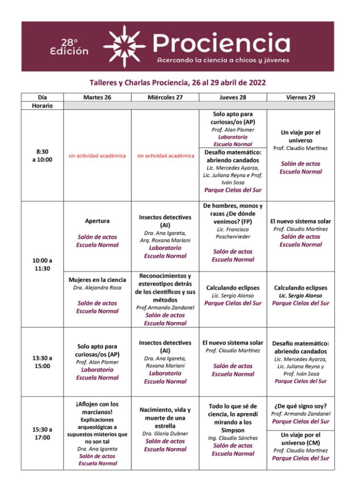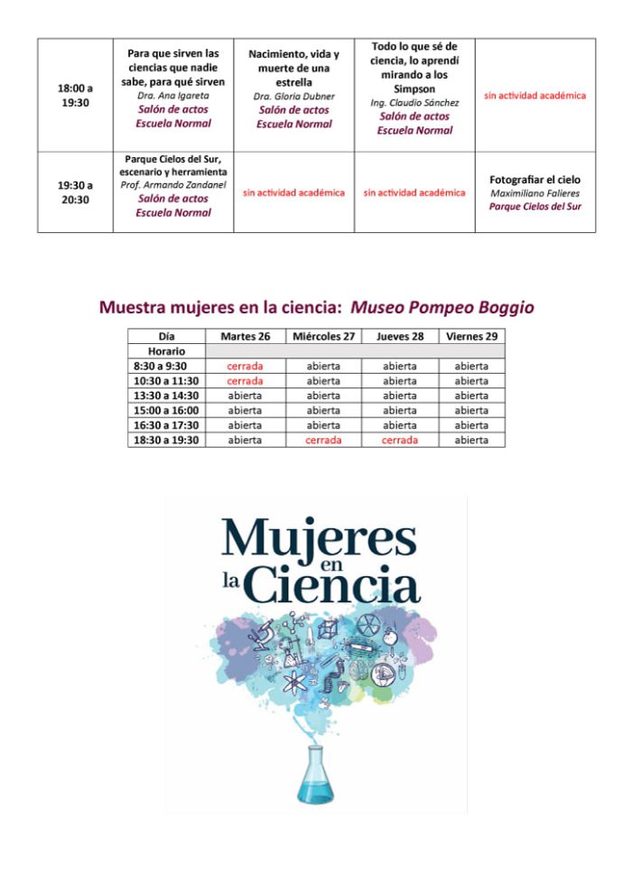 En principio, Vila dijo: “El tópico de este año es Mujeres en la Ciencia, para lo que se van a desarrollar distintas actividades en tres escenarios: Escuela Normal, Parque Cielos del Sur y Museo Pompeo Boggio. Habrá charlas, talleres y muestras fotográficas a lo largo de los cuatro días de desarrollo de la iniciativa que busca acercar a los jóvenes a la ciencia; y también va a presentar un libro el profesor Zandanel”, detalló.
