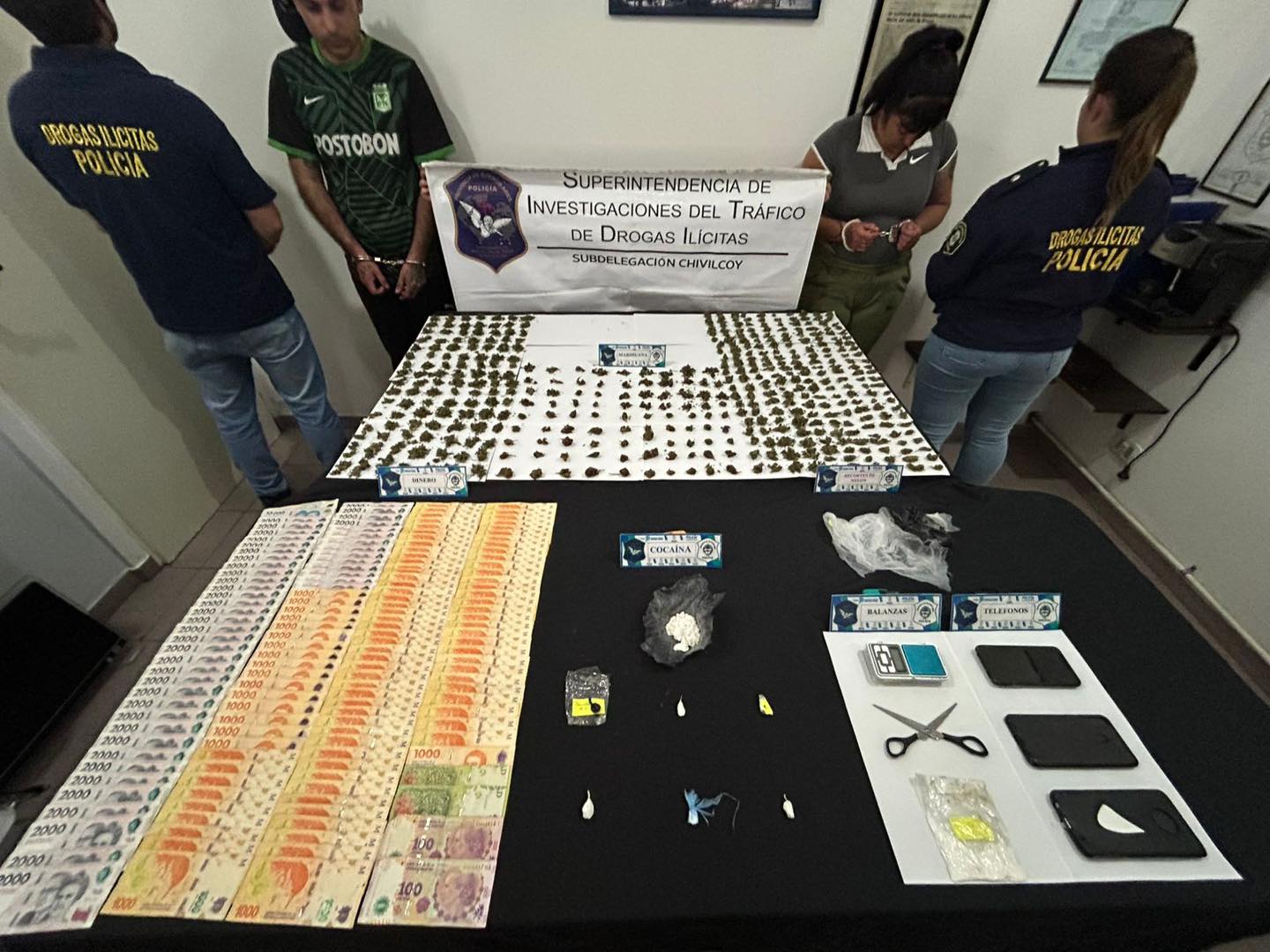 Posteriormente, y siguiendo con el registro de la misma edificación, se procedió al secuestro de un tarro tipo conservas. En su interior se halló sustancia estupefaciente MARIHUANA (cogollos). Además, se encontraron una balanza de precisión, recortes de nylon y varios aparatos de telefonía celular.