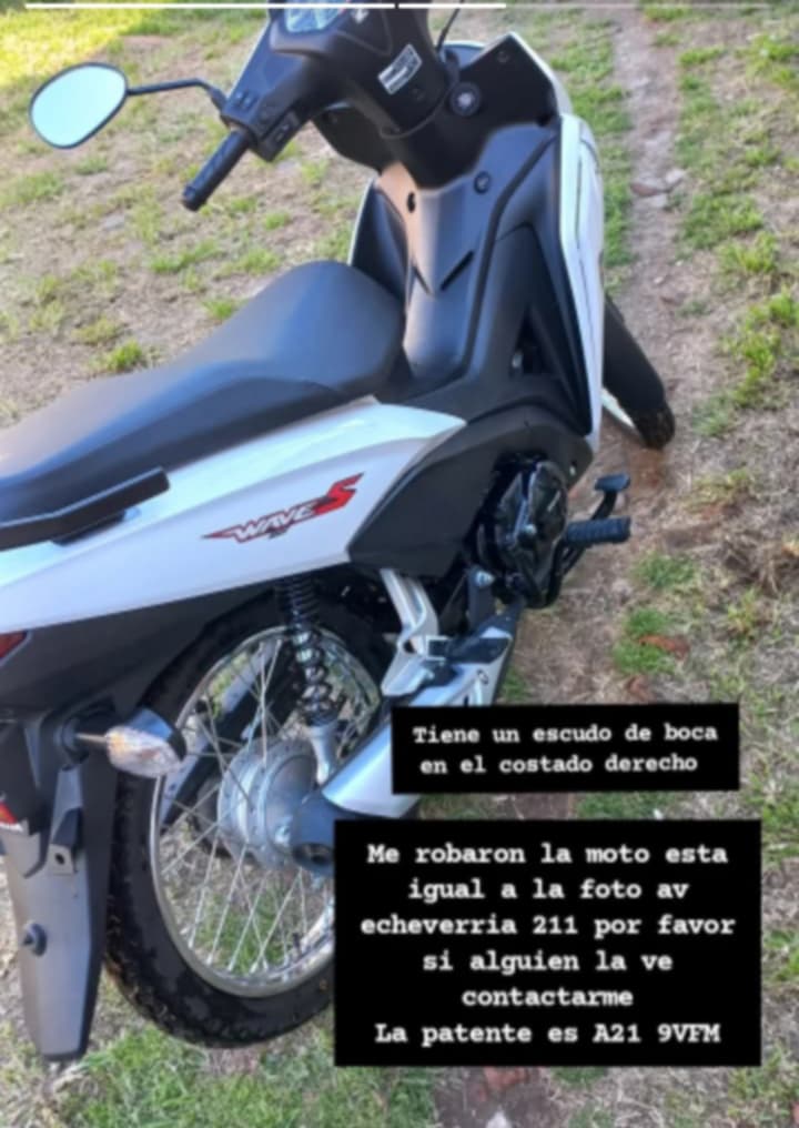 Hace 20 días, a una vecina de nuestra ciudad, le robaron una moto Honda Wave 110 c.c. patente A219VFM, en excelente estado, de Avenida Echeverría al 200. Hizo la correspondiente denuncia, recurrió a las redes sociales difundiendo la situación que atravesaba y para quien pueda aportar datos lo hiciera para poder recuperarla.