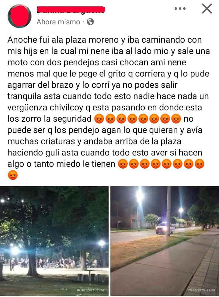 Un matrimonio que se encontraba en Plaza Moreno, publicó en redes en el día de ayer: «Anoche fui a la Plaza Moreno, iba caminando con mis hijos, mi nene iba al lado mío y sale una moto con dos pendejos y casi chocan a mi nene. Menos mal que le pegué el grito que corriera y lo pude agarrar del brazo. No podés salir tranquila». En este sentido, reclamando por la situación, agregó: «No puede ser que ellos hagan lo que quieran, había muchas criaturas y andan por arriba de la plaza haciendo willy».