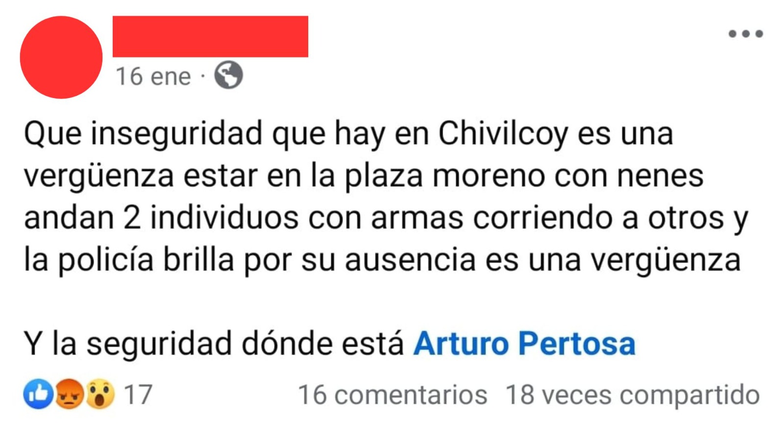El 16 de enero de este año, una vecina de nuestra ciudad, exponía en redes sociales lo que vivió. «Qué inseguridad que hay en Chivilcoy. Es una vergüenza estar en la Plaza Moreno con nenes y que anden dos individuos con armas corriendo a otros».