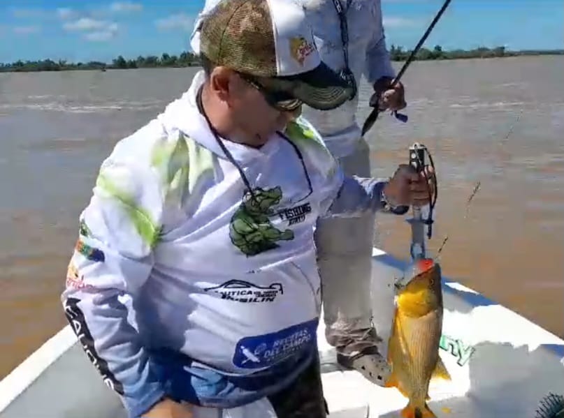 Ya mas entusiasmados volvimos a seguir insistiendo, de repente detrás de una planta caída en el agua, Fernando acuso un pique, clava e instantáneamente un pique en mi señuelo, los dos trayendo doradillos, lindos, que competían a ver cual hacia mas extravagante pirueta fuera del agua al saltar, los acercamos a la embarcación, filmando el doblete para nuestro canal y casi al momento de subirlos, el que estaba en mi artificial, da un ultimo salto y en el aire como saludándome se desprendió del mismo dejándome sin mi premio.