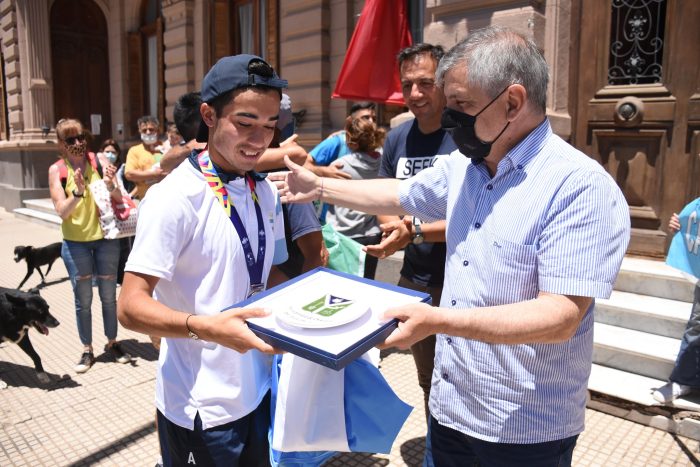 En la vereda del Palacio Municipal, el jefe comunal le entregó un reconocimiento por este logro obtenido en Cali y lo felicitó por seguir representado a nuestra ciudad tan bien tanto a nivel nacional como internacional.
