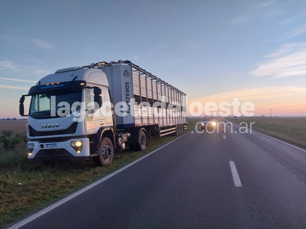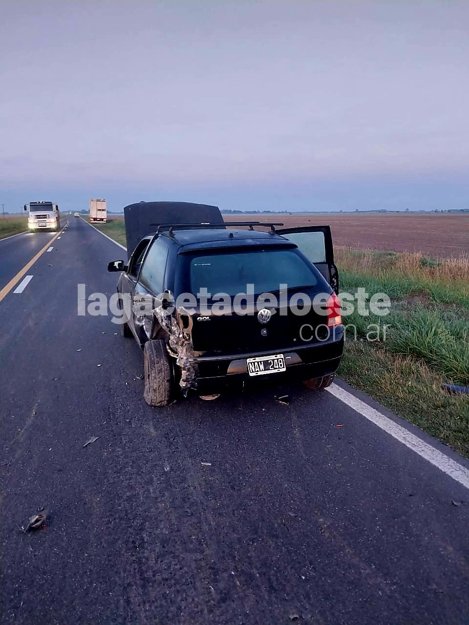 Constatan que en sentido Gorostiaga-Chivilcoy habían colisionado un vehículo marca VW Gol, color negro, dominio NAW-248 que era conducido por *Dardo Rafael Martelli de 45 años domiciliado en Bragado y un camión marca IVECO, modelo 450330, tipo tractor con cabina, con jaula doble piso hacienda, descargado, marca IVECO, patente AG284ZS en el que circulaba Felipe Santiago Carrizo de 65 años de edad, oriundo de Santa Fe.