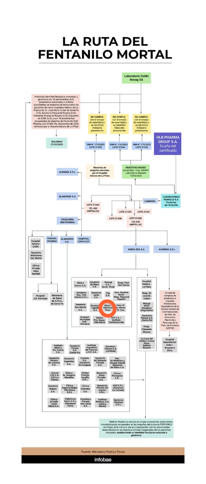 La investigación judicial por el fentanilo clínico contaminado sacudió en las últimas semanas a la red hospitalaria del país. La ANMAT detectó irregularidades en el lote 31202 del analgésico. También, la Justicia federal ordenó allanamientos a laboratorios y a la droguería Nueva Era, que figura como distribuidora del lote. Según documentos incorporados a la causa, la firma habría adquirido 50.000 ampollas. Además, habría comercializado alrededor de 48.300 a hospitales y municipios de distintas provincias. Hay menciones específicas a establecimientos de Buenos Aires, Córdoba, Santa Fe y a la Municipalidad de Chivilcoy.