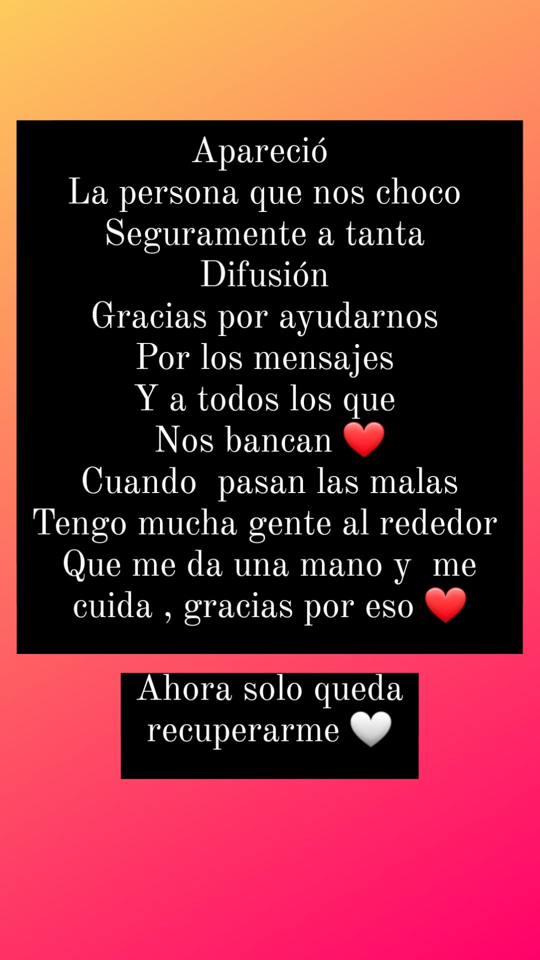 La persona que conducía el otro vehículo no se detuvo, pero hace pocas horas, Manti informó que se había presentadogradeció la difusión para dar con el responsable de la violenta colisión.