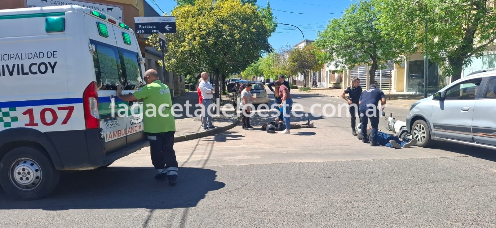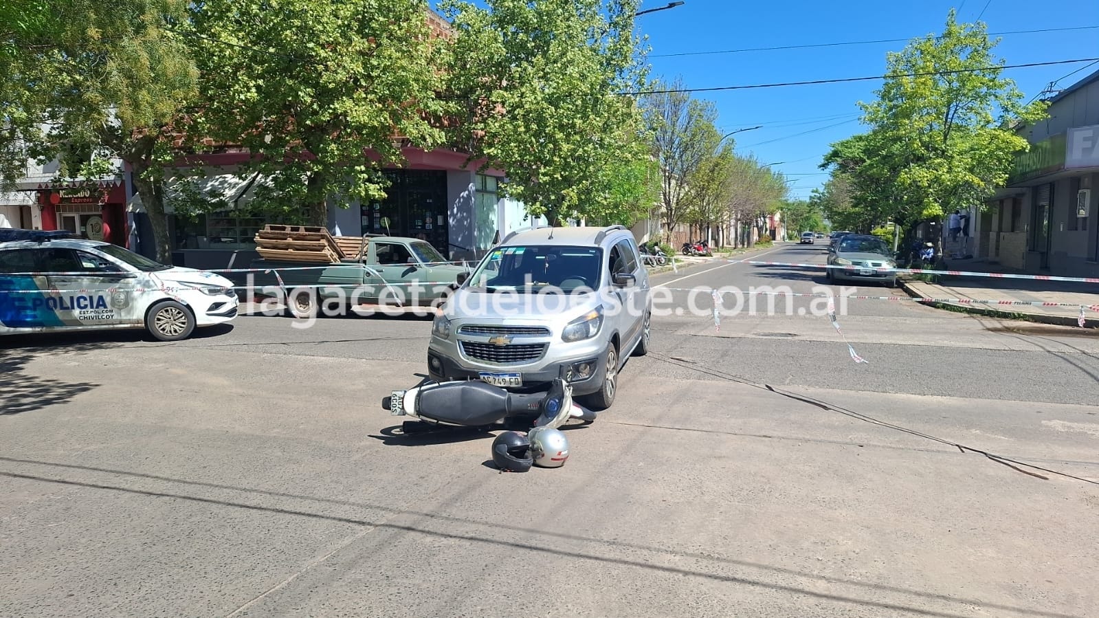 El hecho involucró a una Chevrolet Spin Activ, conducida por María Laura Guidobaldi, y a una motocicleta de 110 c.c. en la que circulaban dos ocupantes que resultaron heridos.