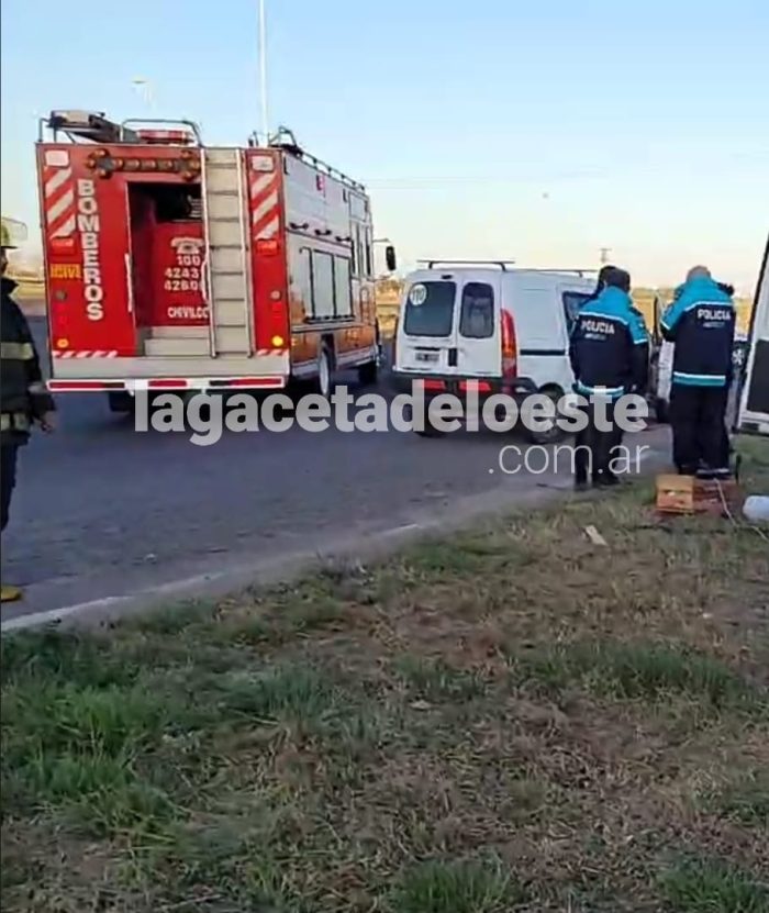 Un hombre fue rescatado por bomberos y se encuentra internado en Terapia Intensiva del Hospital Municipal. En la tarde del sábado, poco antes de las 18, en la rotonda de la Ruta Nacional 5 y Provincial 30 una Renault Kangoo Blanca IYH 198 que era conducida por Miguel Gonzalez de 59 años de edad y acompañado por Alberto Gonzalo Perez de 30 oriundos de Pablo Nogues Malvinas Argentinas, quienes circulaban por ruta provincial 30, habría perdido el control rodado cruzándose hacia Ruta Nacional 5 provocando pérdida de control de la Peugeot Partner color Blanca patente NFM 116 la cual colisiona con columna alumbrado de la rotonda.