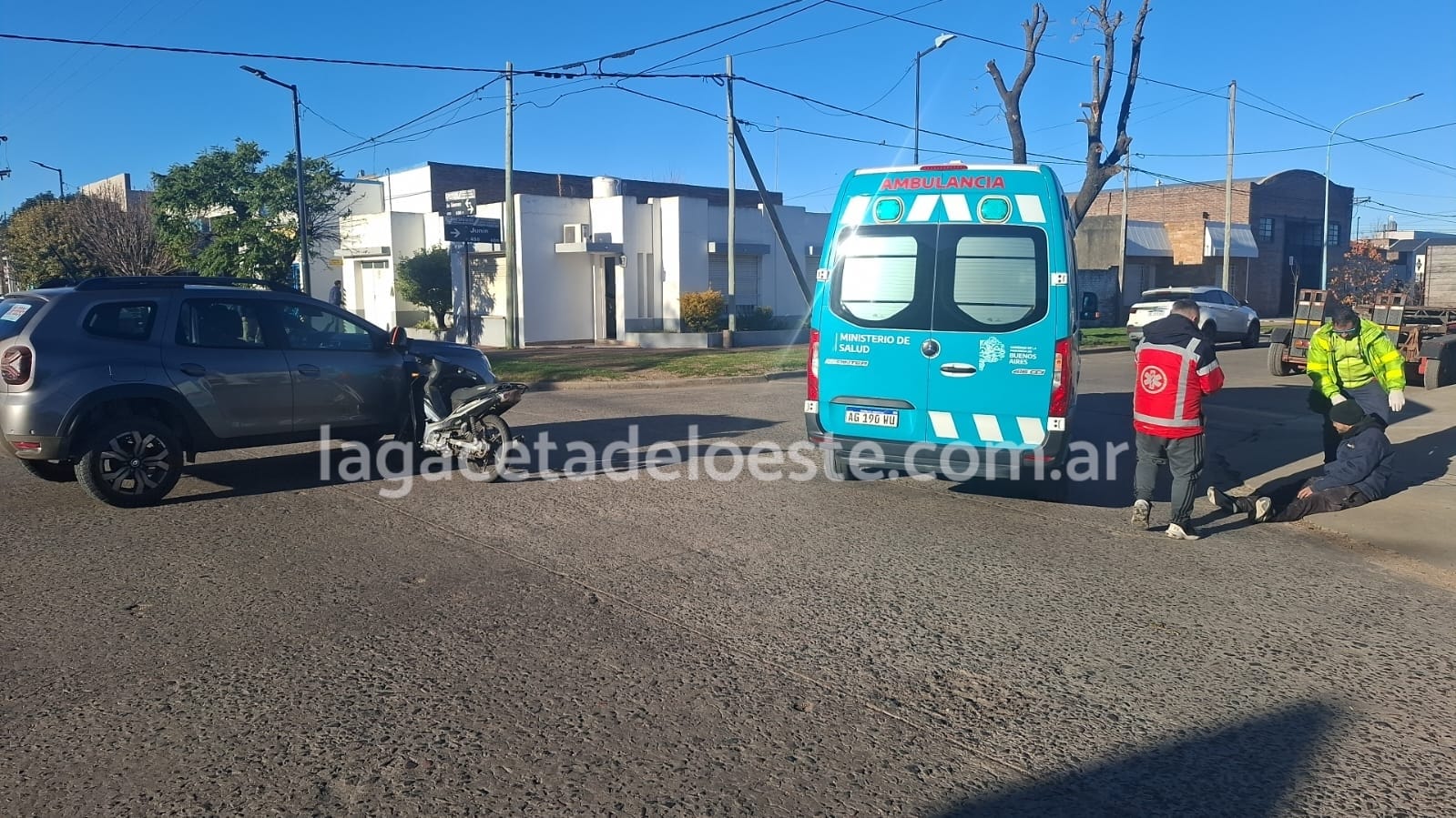 Una Renault Duster patente AH456VR conducida por Delfina Cangini quien según testigos cruzaba la avenida por calle Junín, fue impactada por una moto en la que circulaba Leonardo Guzmán quien fue trasladado por Gabriel Luján y Carlos García de SAME al Hospital Municipal «Dr. Santiago Fornos».