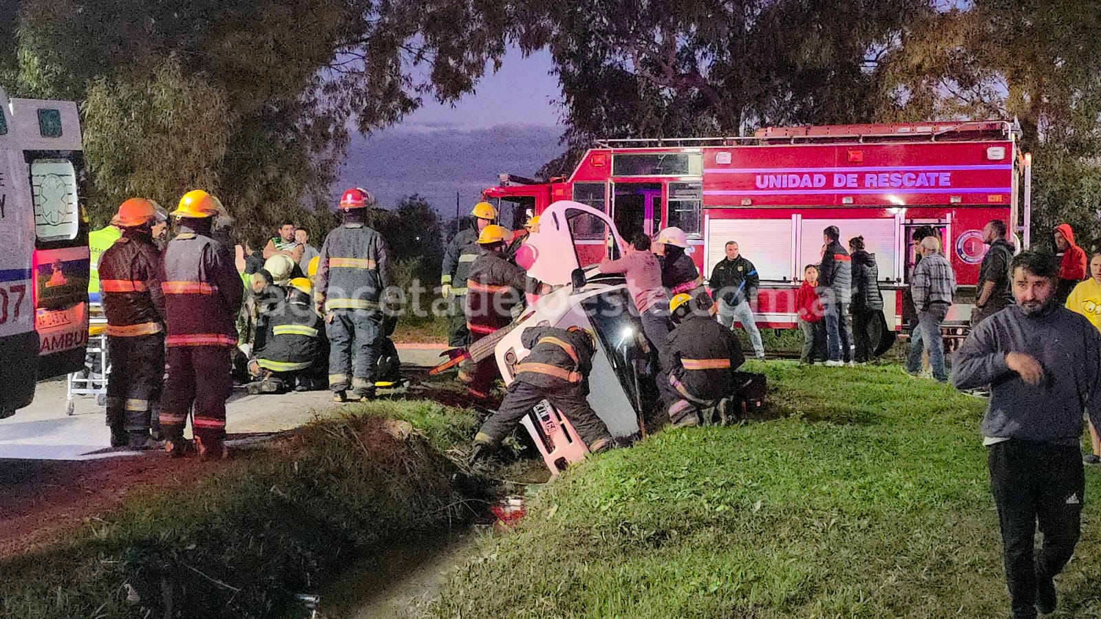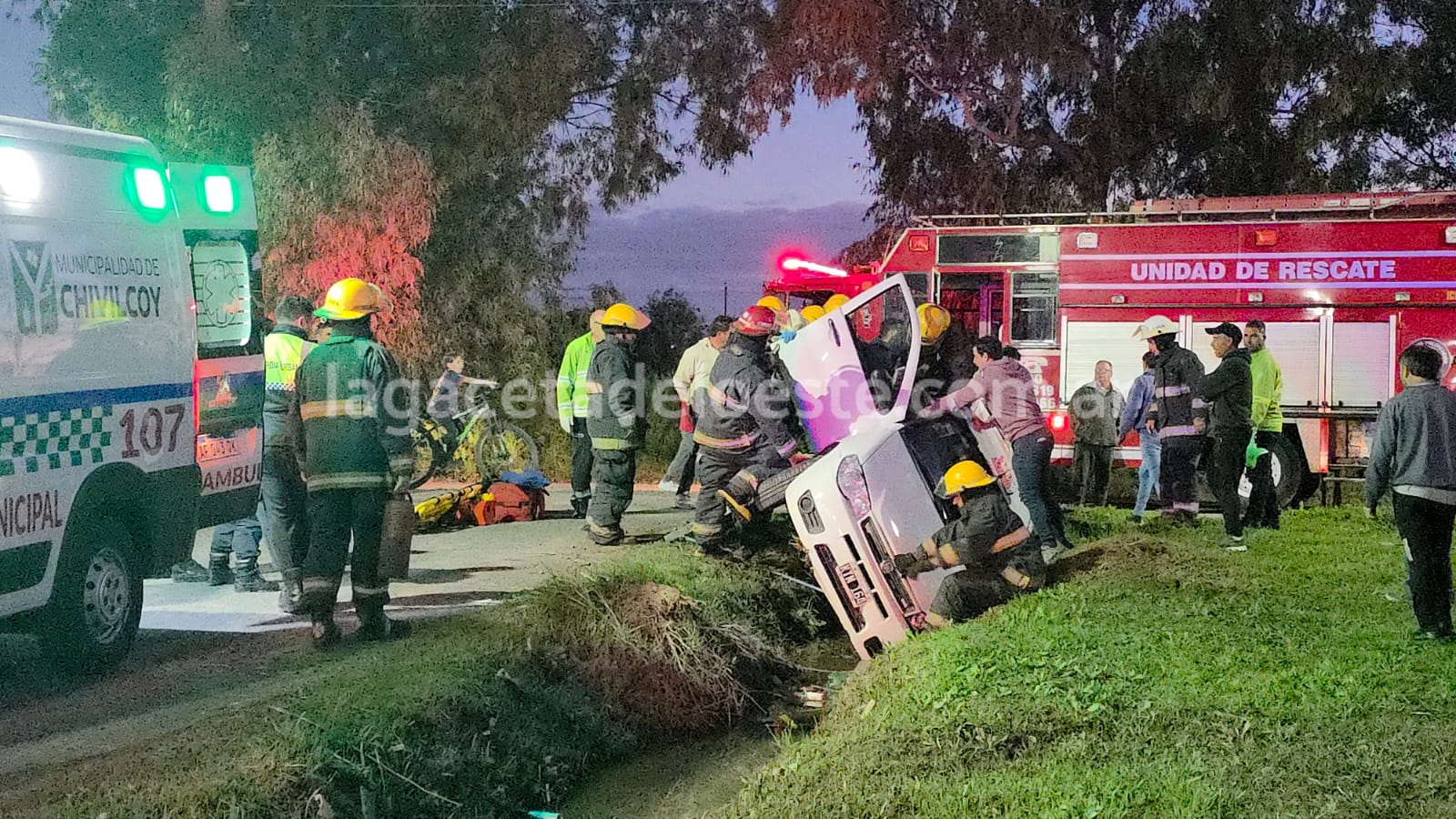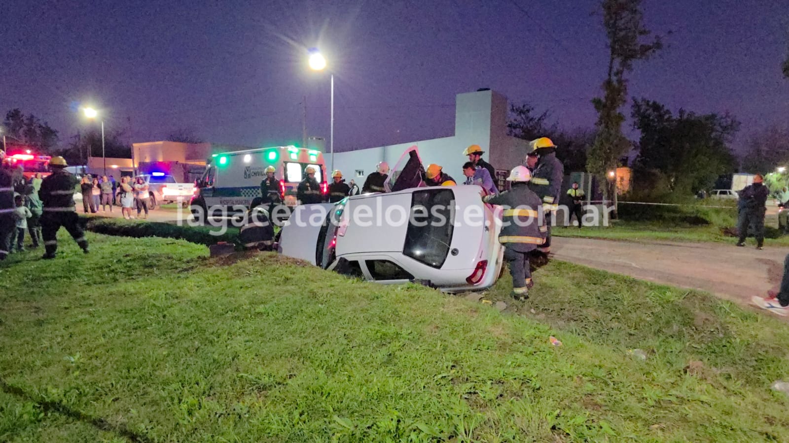 El automóvil quedó dentro de la zanja apoyado sobre el lateral izquierdo. Bomberos rescataron al conductor identificado como Raúl Alberto Prosini de 75 años de edad, quien fue atendido en el lugar por SAME a cargo de Gabriel Luján y Raúl Carbone, sin requerir ser trasladado al Hospital Municipal.